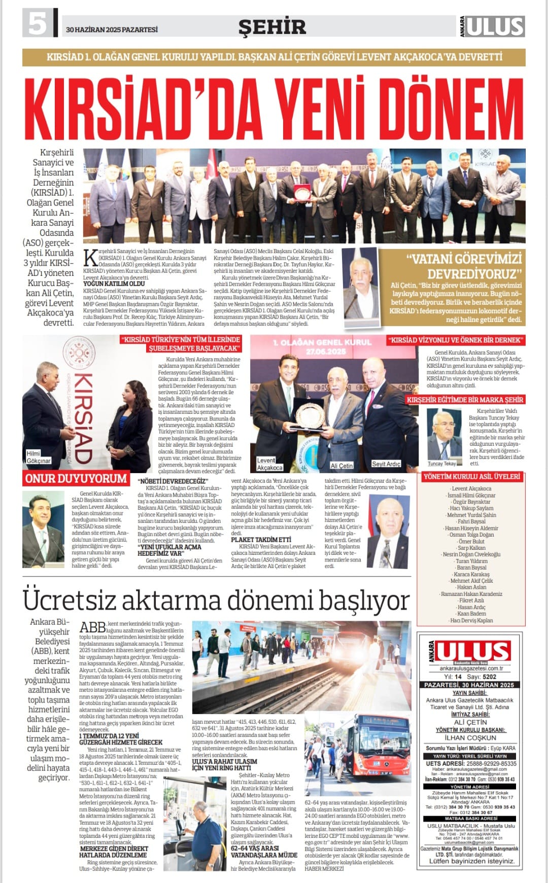 Kırşehirli Sanayici ve İş İnsanları Derneği'nin (KIRSİAD) 1. Olağan Genel Kurulu Ankara Sanayi Odası'nda (ASO) gerçekleşti. Kurulda 3 yıldır KIRSİAD'ı yöneten Kurucu Başkan Ali Çetin, görevi Levent Akçakoca^ya devretti.